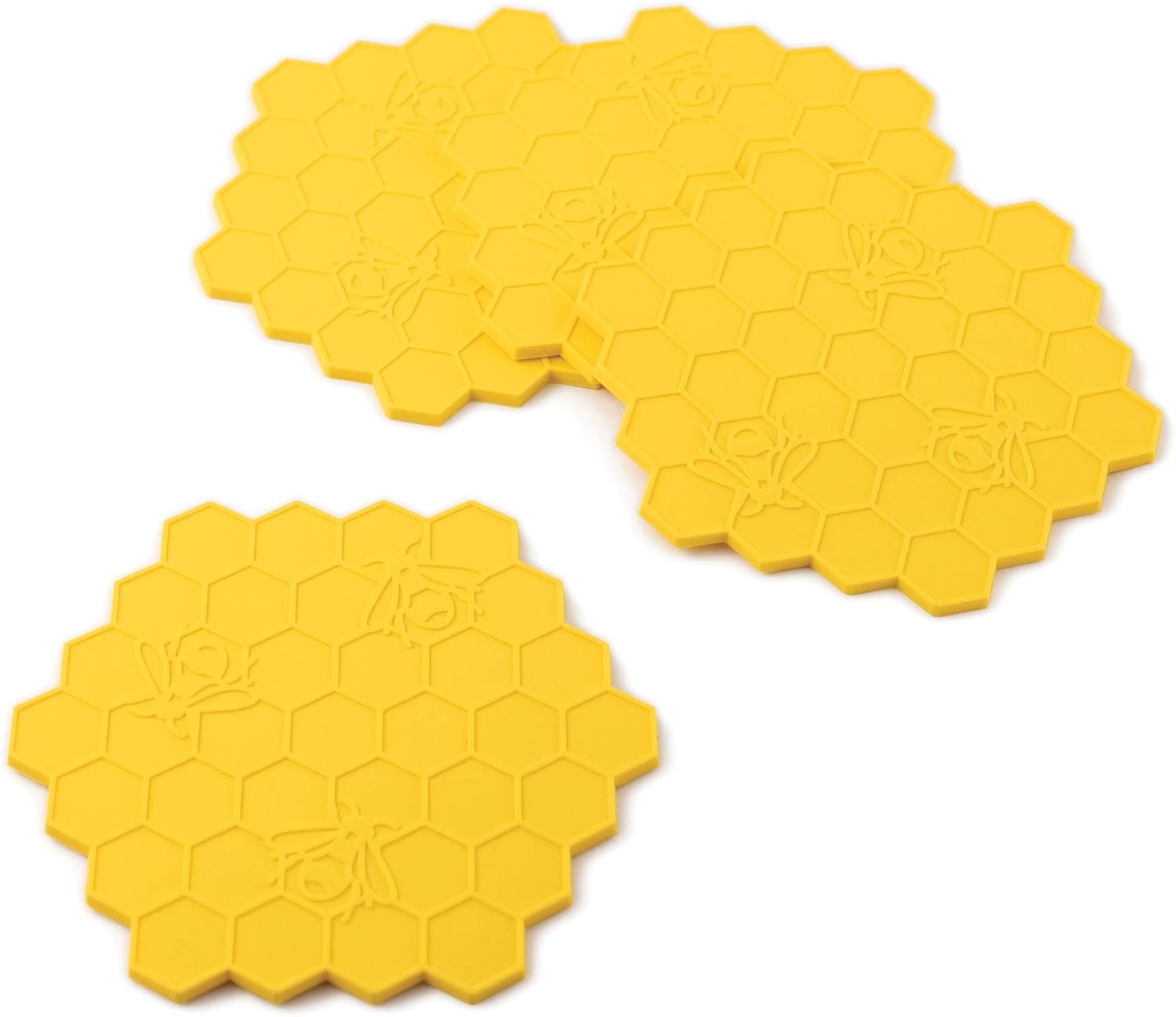 Beehive-Shaped Silicone Drink Coasters – Non-Slip, Anti-Stain, Heat-Resistant, Reusable Coasters for Drinks, Yellow, 3.75 x 4.25 Inches, Set of 4