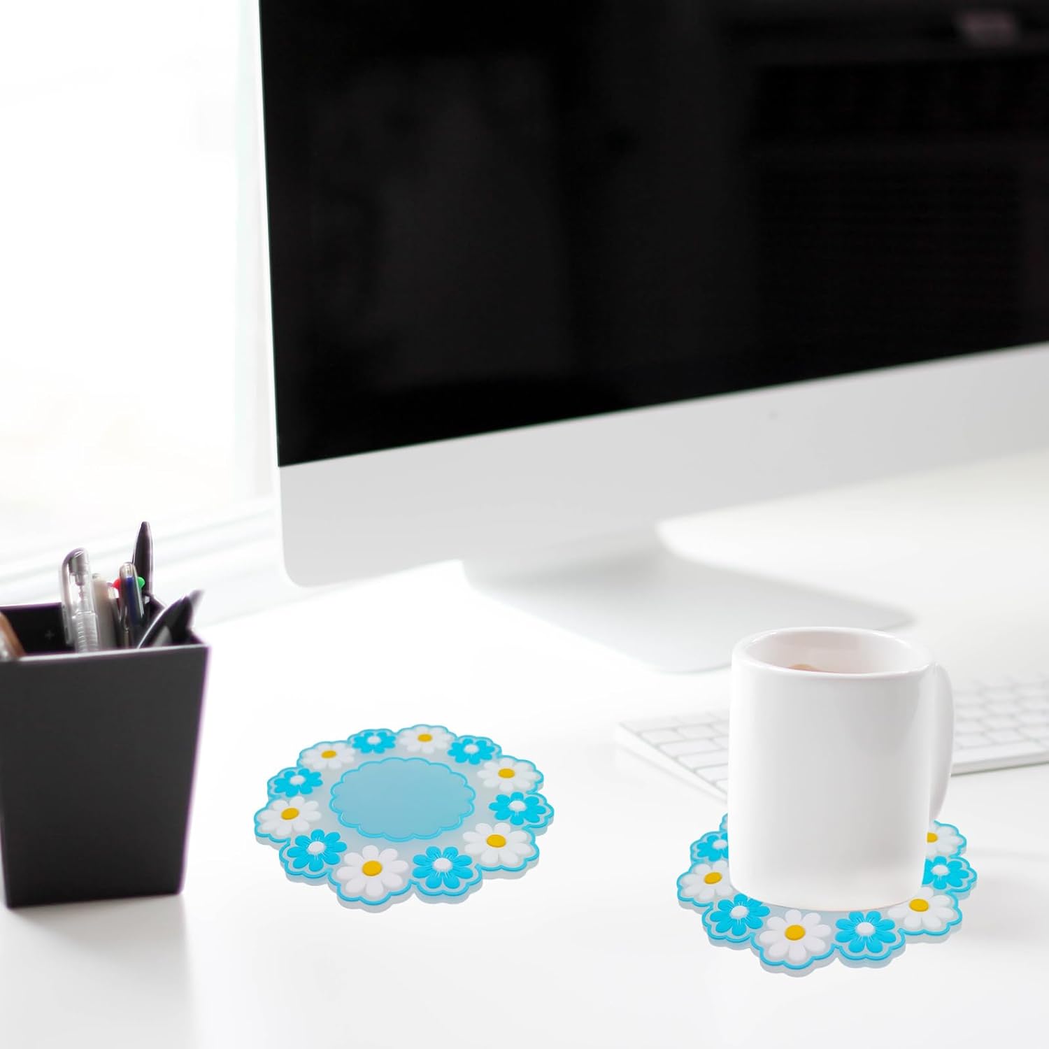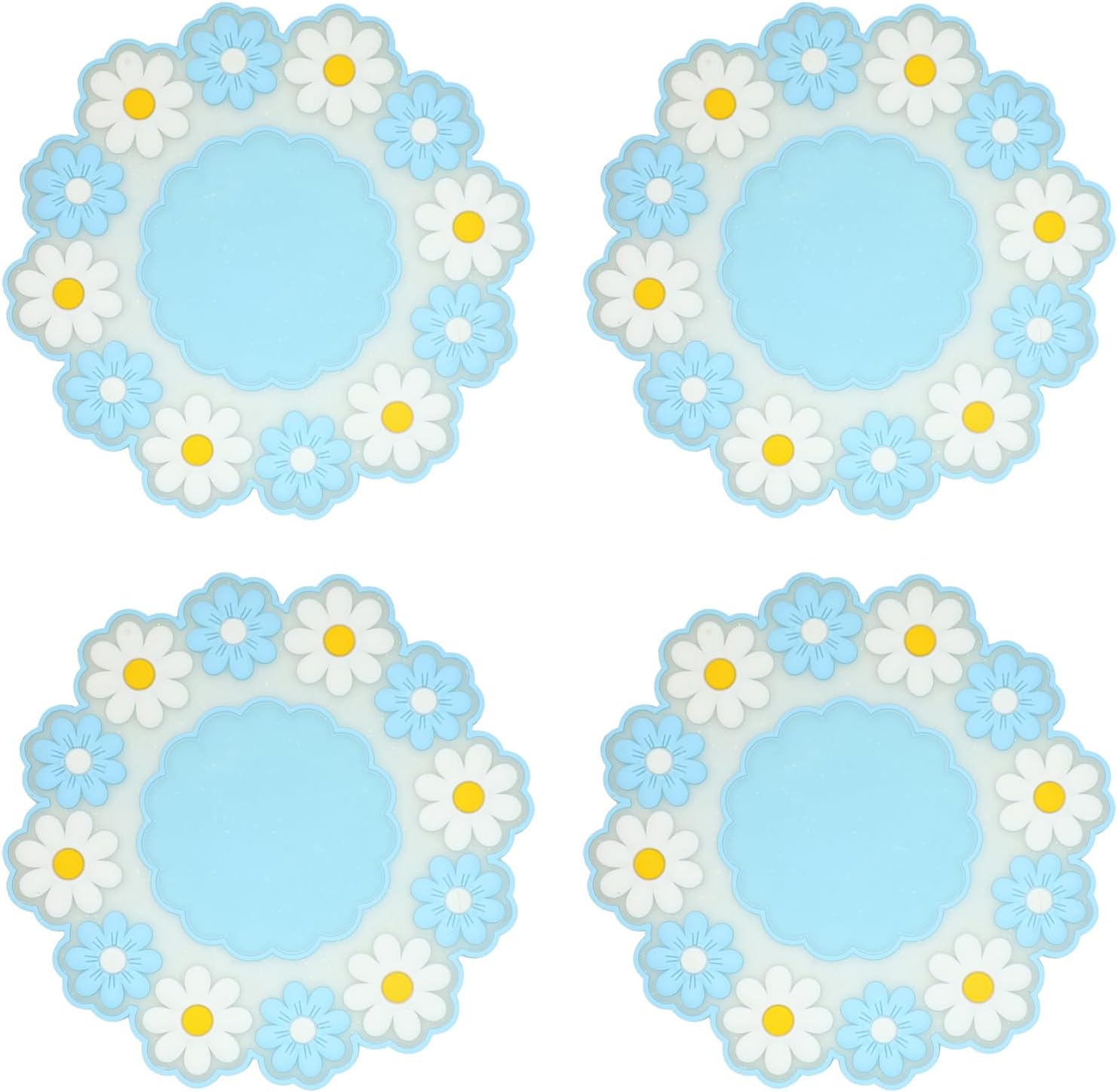 Coasters for Drinks, Cute Coaster for Coffee Table Set of 4 Non-Slip PVC Silicone Coasters for Tabletop Protection, Daisy Flower Pattern Heat Insulation Placemat (4 Blue)
