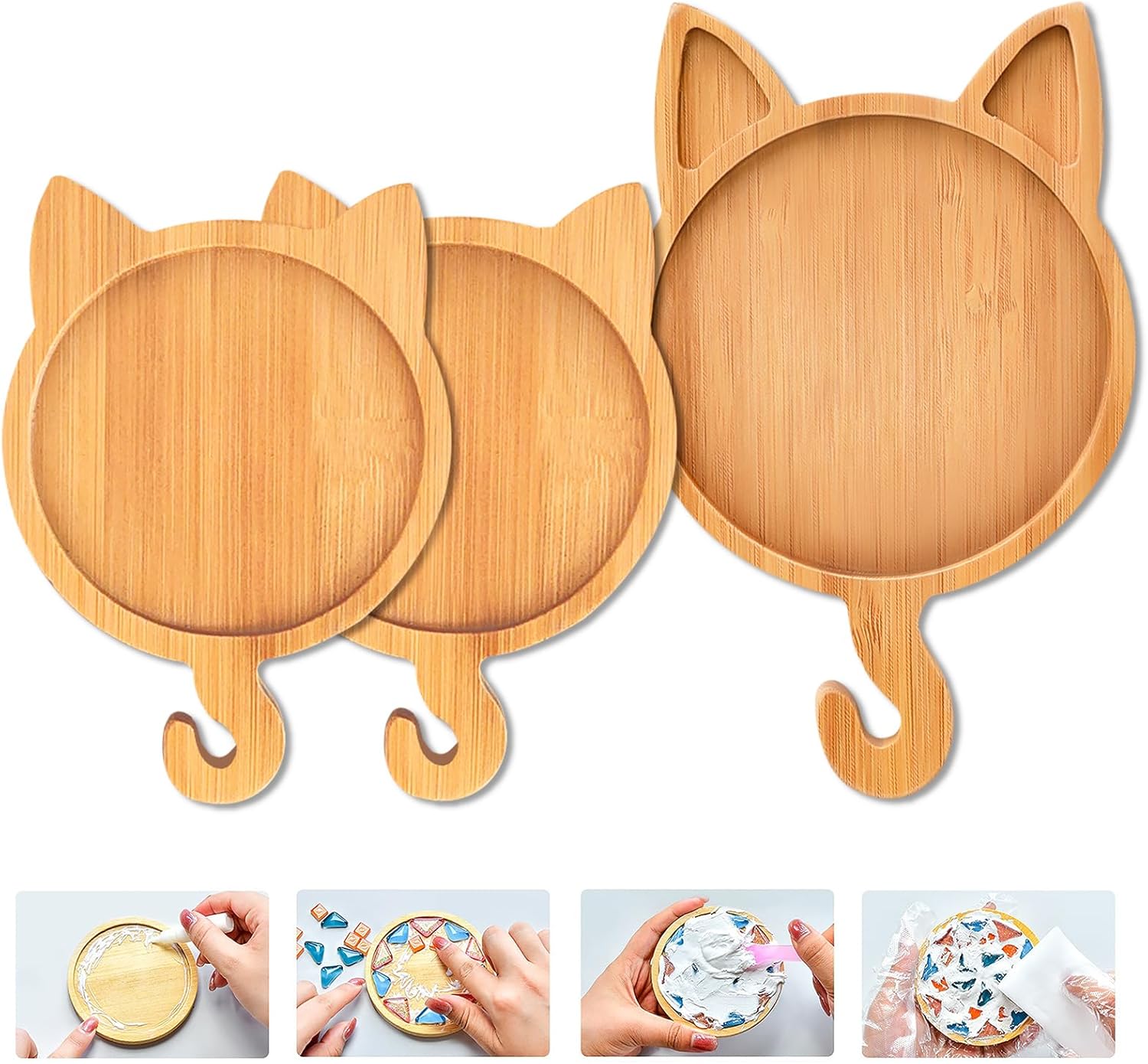 Mosaic Bamboo Coasters, DIY Base Trays, Blank Coaster for DIY Crafts (1 Large + 2 Small, Cat-Shaped)