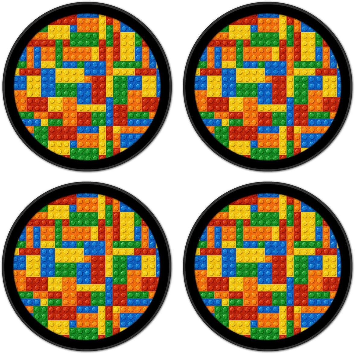 - SET OF 4 ABORBENT COASTERS: Set of four unique silicone and absorbent printed felt drink coasters that prevent drips, puddles, and water stains to your fine furniture. Suitable for indoors or outdoors. Works great for hot or cold drinks. Perfect for high humidity locations. Printed with colorful image of Building Blocks